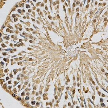 Immunohistochemistry of paraffin-embedded rat testis using XRCC3 antibody at dilution of 1:200 (40x lens).