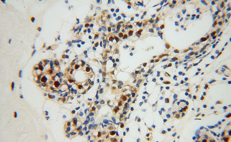 Immunohistochemical of paraffin-embedded human colon cancer using Catalog No:116876(XRCC5 antibody) at dilution of 1:100 (under 40x lens)