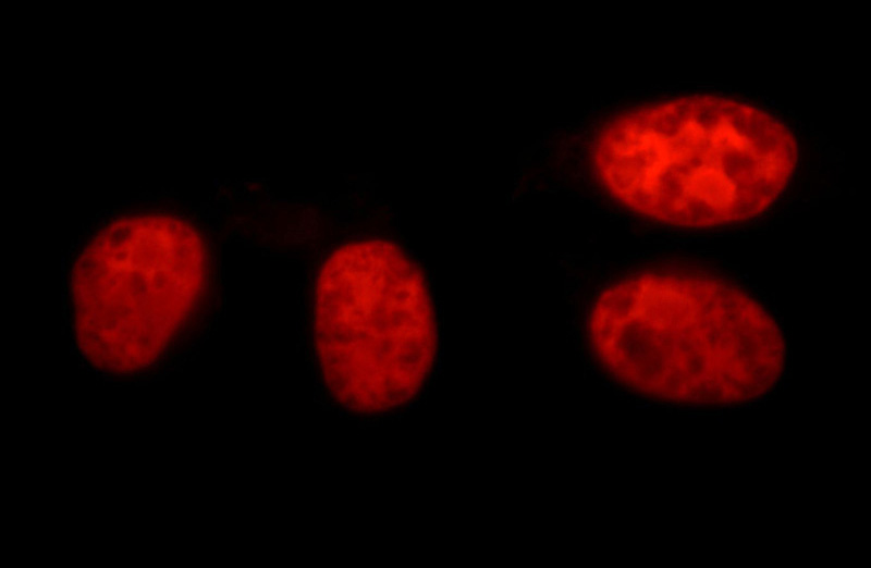 Immunofluorescent analysis of HepG2 cells, using XRCC5 antibody Catalog No:116876 at 1:50 dilution and Rhodamine-labeled goat anti-rabbit IgG (red).