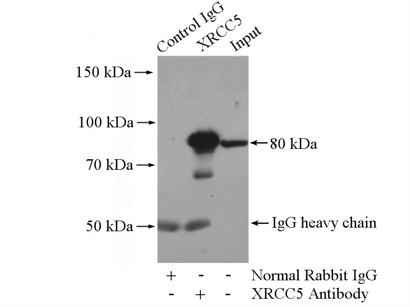 XRCC5/Ku80 Rabbit Polyclonal antibody. Positive IP detected in HEK-293 cells. Positive WB detected in HepG2 cells, A431 cells, HEK-293 cells, HeLa cells, human liver tissue, K-562 cells. Positive IF detected in HepG2 cells. Positive IHC detected in human colon cancer tissue, human lung cancer tissue. Observed molecular weight by Western-blot: 80 kDa