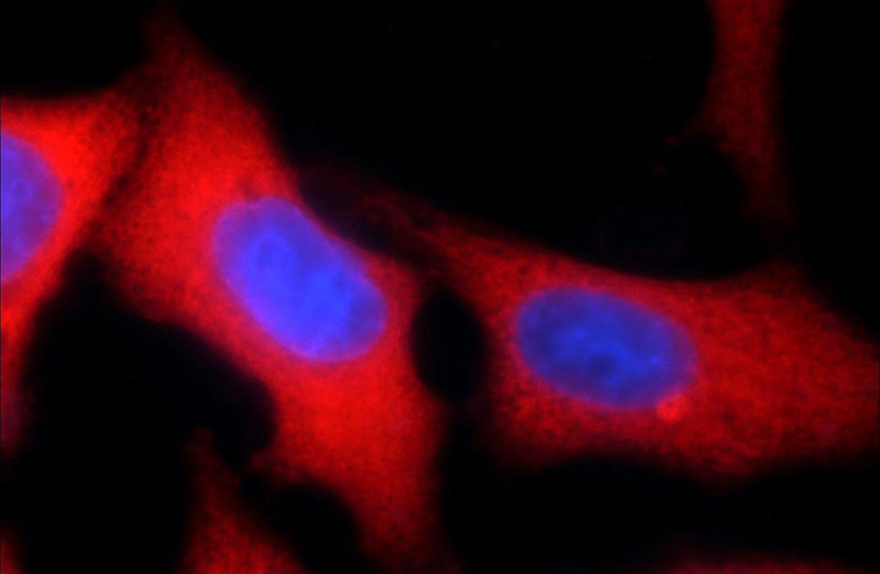 Immunofluorescent analysis of HepG2 cells using Catalog No:116880(YAP1 Antibody) at dilution of 1:50 and Rhodamine-Goat anti-Rabbit IgG