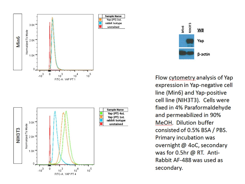 FC result of YAP antibody (Catalog No:116880) with Min6 and NIH3T3 cell by Sarvetnick Lab, UNMC