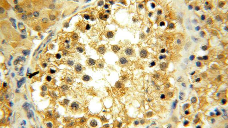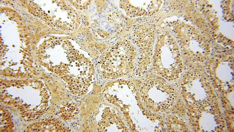 Immunohistochemical of paraffin-embedded human testis using Catalog No:116881(YARS2 antibody) at dilution of 1:100 (under 10x lens)