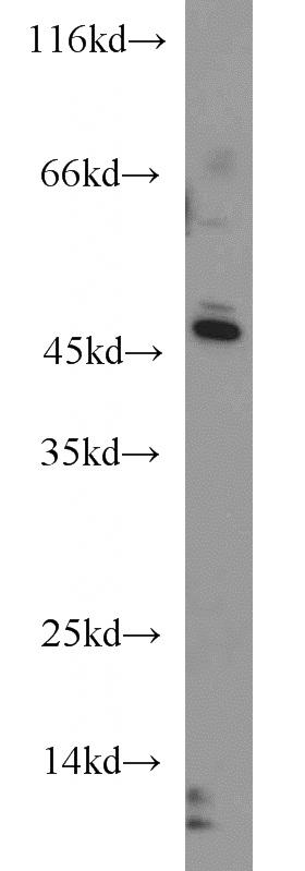 K-562 cells were subjected to SDS PAGE followed by western blot with Catalog No:116881(YARS2 antibody) at dilution of 1:800