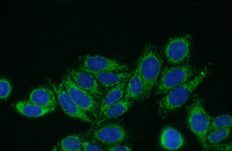 Immunofluorescent analysis of (10% Formaldehyde) fixed HepG2 cells using Catalog No:116881(YARS2 Antibody) at dilution of 1:50 and Alexa Fluor 488-congugated AffiniPure Goat Anti-Rabbit IgG(H+L)