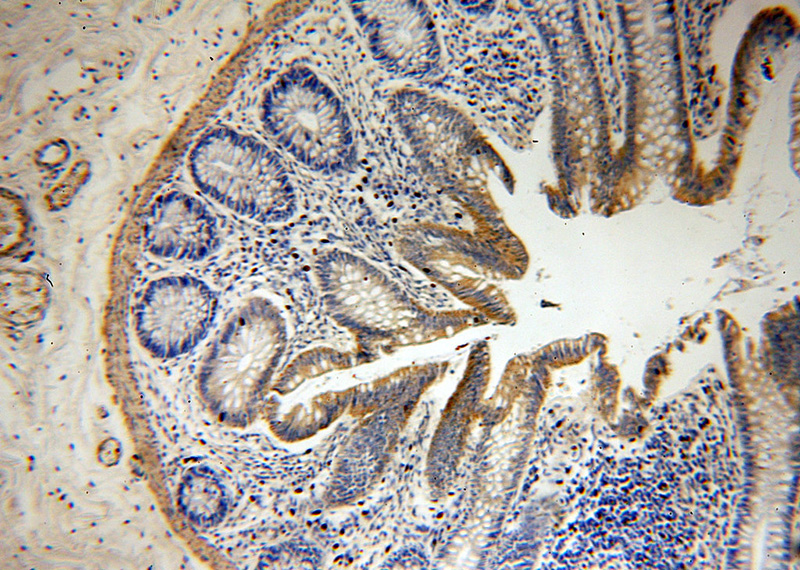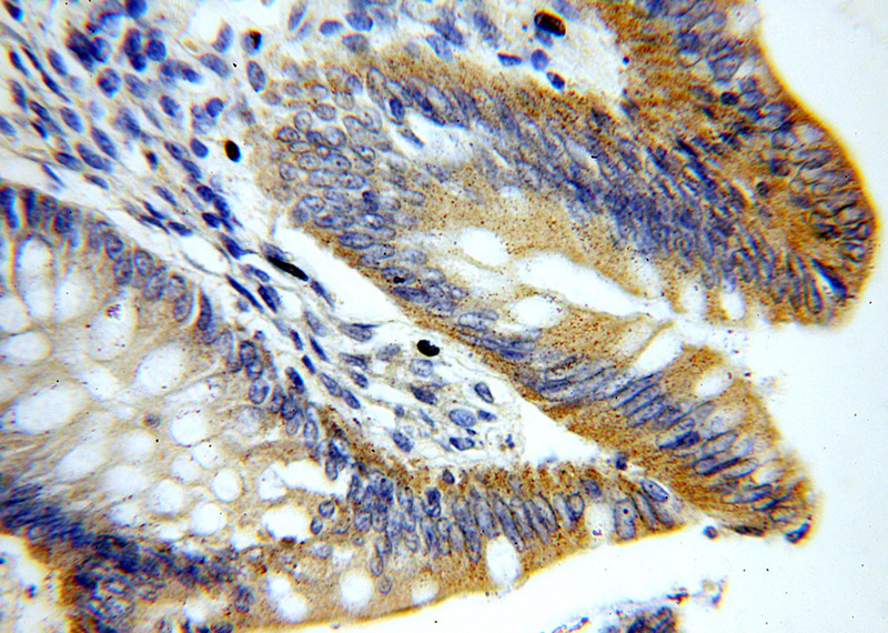 Immunohistochemical of paraffin-embedded human colon using Catalog No:116884(YES1-Specific antibody) at dilution of 1:50 (under 10x lens)