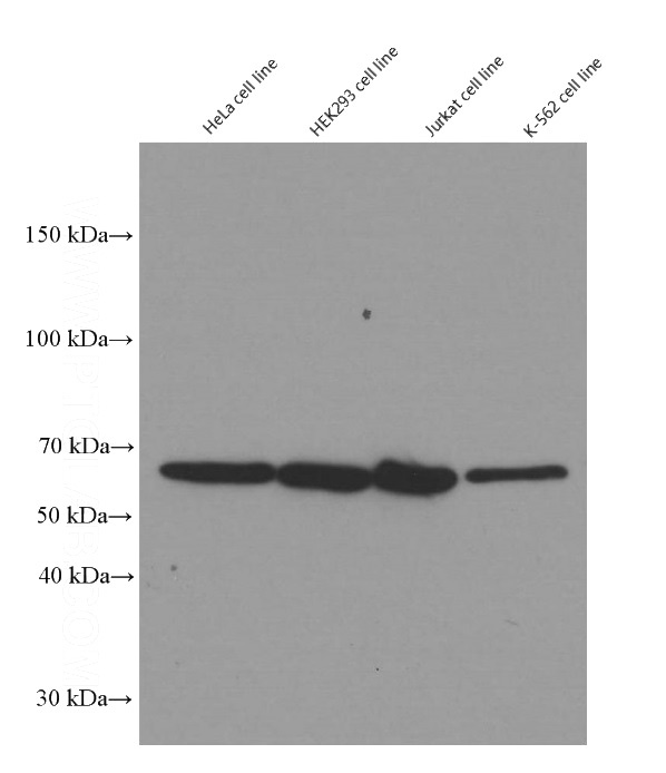 Western blot of YY1 in various human cell lines with Catalog No:117348 at dilution of 1:50000.