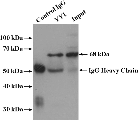 YY1 Mouse Monoclonal antibody. Positive WB detected in C6 cells, COS-7 cells, HeLa cells, NIH/3T3 cells. Positive IP detected in NIH/3T3 cells. Positive IF detected in HepG2 cells. Observed molecular weight by Western-blot: 68 kDa
