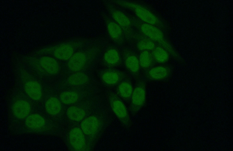 Immunofluorescent analysis of (10% Formaldehyde) fixed HepG2 cells using Catalog No:117348(YY1 Antibody) at dilution of 1:400 and Alexa Fluor 488-congugated AffiniPure Goat Anti-Mouse IgG(H+L)
