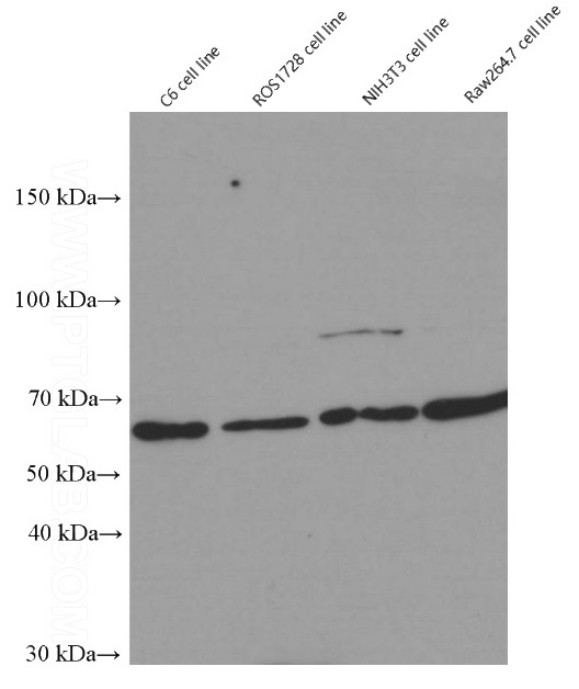 Western blot of YY1 in rat (C6 and ROS1728) and mouse(NIH3T3 and Raw264.7) cell lines with Catalog No:117348 at dilution of 1:50000.