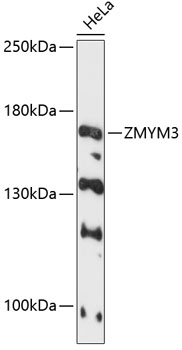 Western blot analysis of extracts of HeLa cells, using ZMYM3 antibody at 1:3000 dilution.Secondary antibody: HRP Goat Anti-Rabbit IgG (H+L) at 1:10000 dilution.Lysates/proteins: 25ug per lane.Blocking buffer: 3% nonfat dry milk in TBST.Detection: ECL Basic Kit .Exposure time: 90s.