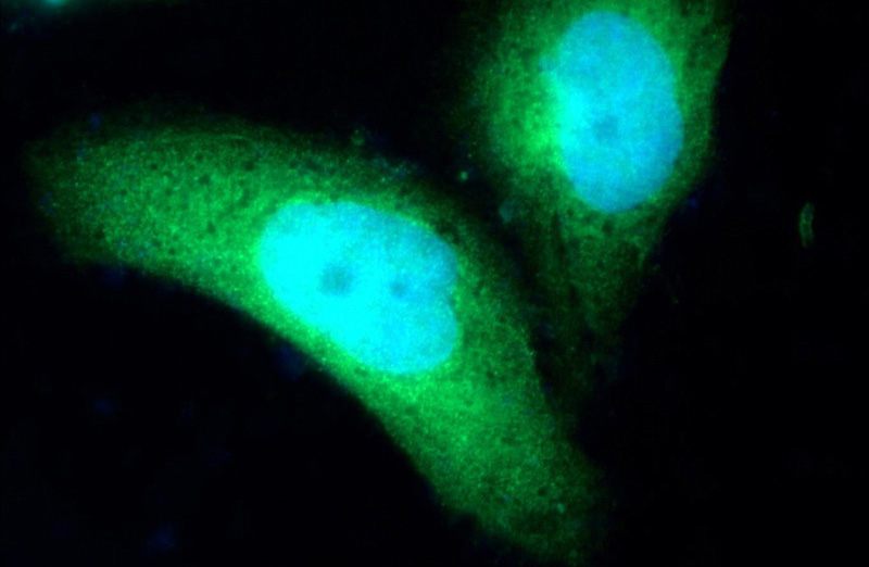 Immunofluorescent analysis of HepG2 cells using Catalog No:116960(ZNF215 Antibody) at dilution of 1:25 and Alexa Fluor 488-congugated AffiniPure Goat Anti-Rabbit IgG(H+L)