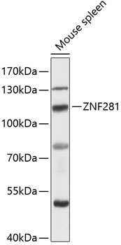 Western blot analysis of extracts of mouse spleen, using ZNF281 antibody at 1:3000 dilution.Secondary antibody: HRP Goat Anti-Rabbit IgG (H+L) at 1:10000 dilution.Lysates/proteins: 25ug per lane.Blocking buffer: 3% nonfat dry milk in TBST.Detection: ECL Basic Kit .Exposure time: 10s.