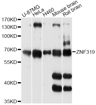 Western blot analysis of extracts of various cell lines, using ZNF319 antibody at 1:3000 dilution.Secondary antibody: HRP Goat Anti-Rabbit IgG (H+L) at 1:10000 dilution.Lysates/proteins: 25ug per lane.Blocking buffer: 3% nonfat dry milk in TBST.Detection: ECL Basic Kit .Exposure time: 30s.