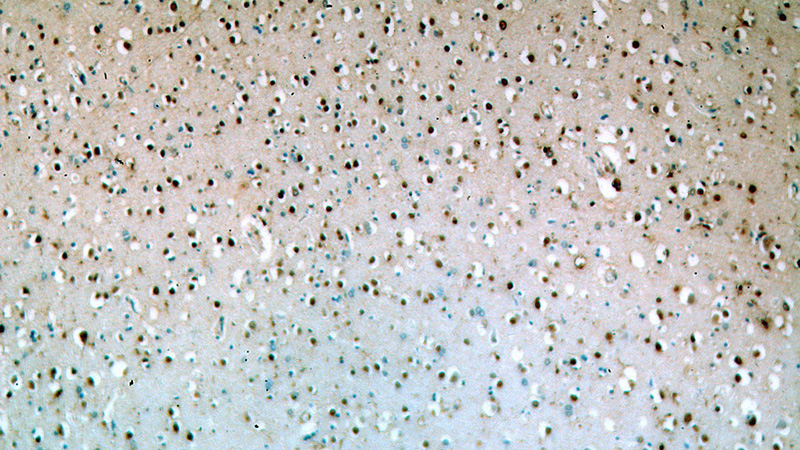 Immunohistochemical of paraffin-embedded human brain using Catalog No:117163(ZNF34 antibody) at dilution of 1:50 (under 10x lens)
