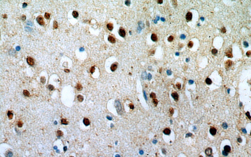 Immunohistochemical of paraffin-embedded human brain using Catalog No:117163(ZNF34 antibody) at dilution of 1:50 (under 40x lens)