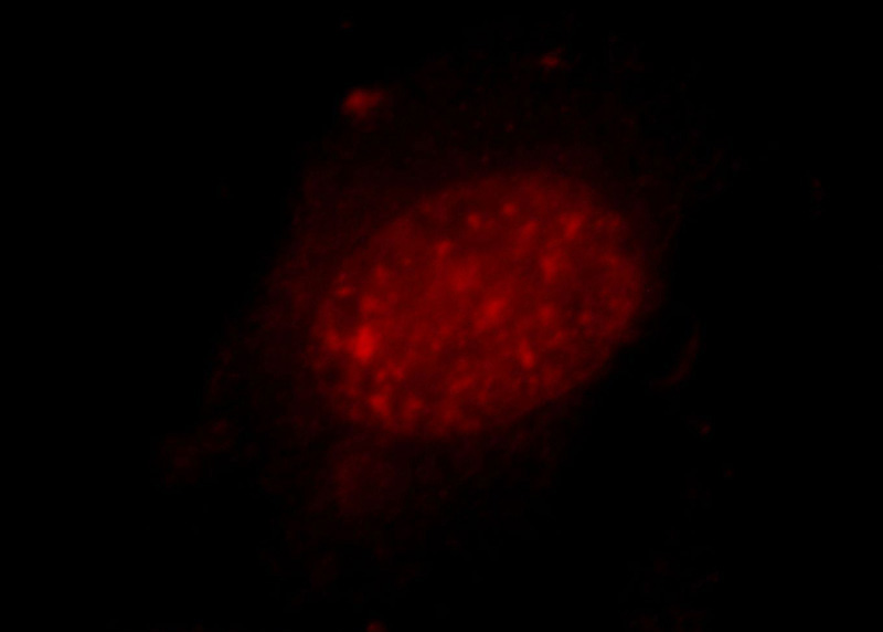 Immunofluorescent analysis of Hela cells, using ZXDC antibody Catalog No:117273 at 1:25 dilution and Rhodamine-labeled goat anti-rabbit IgG (red).